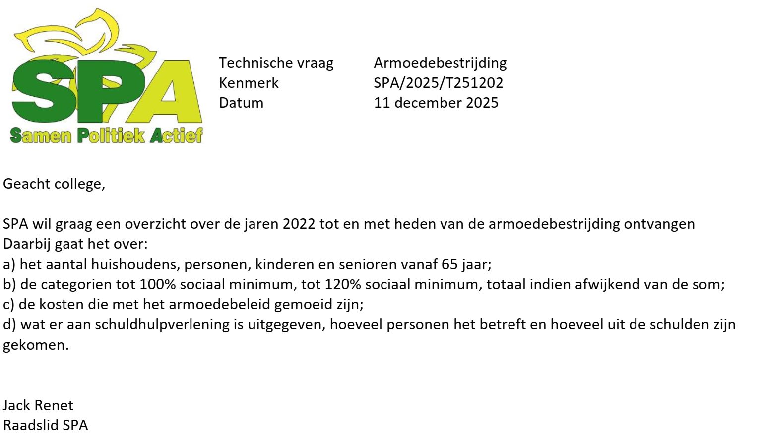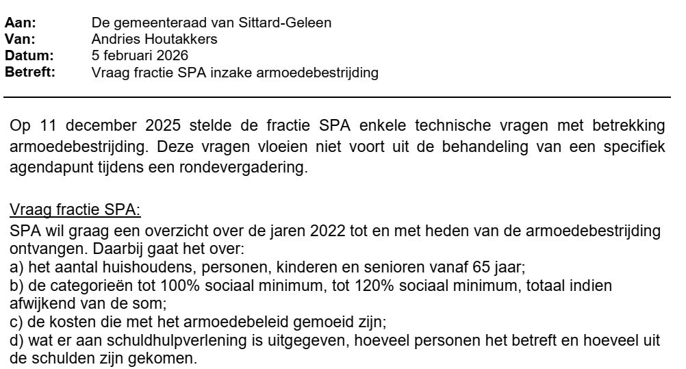 Alle partijen zijn het er al jaren over eens dat armoedebestrijding hoge prioriteit moet hebben in onze gemeente. Zonder alle verkiezingsprogramma’s (volledig) gelezen te hebben durf ik de stelling aan dat ELKE partij daar wel iets over schrijft. En toch is er geen goed overzicht van wat er allemaal gedaan wordt, hoeveel geld erin omgaat, hoeveel mensen en gezinnen het betreft, wat de resultaten zijn. SPA besteedt in haar ‘Achtergronden Programma 2026’ onder ‘Mensen’ veel aandacht aan armoede en schuldhulpverlening. Tijdens het schrijven daarvan bleek eens te meer dat er GEEN overzicht in de P&C-stukken is van dit zo belangrijke beleidsterrein. Daarom stelde SPA (op 11 december 2025 !)vragen aan het college om zo’n overzicht te krijgen. Vandaag ontving SPA antwoord. Dat antwoord kwam erop neer dat SPA zelf maar op internet moet zoeken naar data. Nogal teleurstellend. Ik ben gewend om te zoeken maar wanneer IK vraag om data dan is dat omdat IK geen goed overzicht kan maken. Moeten raadsleden zelf diepgaand onderzoek verrichten om basisdata van belangrijke beleidsterreinen boven water te halen? Wat zegt dit over de P&C-stukken? Daarin worden honderden pagina’s geschreven met prachtige teksten maar veel overzichten ontbreken. Ik wijs daarbij ook op mijn nog steeds niet beantwoordde vraag naar een compleet overzicht van alle verleende subsidies. Aannemende dat het college antwoord WIL geven op vragen naar overzichten kan ik niet anders dan constateren dat men de informatie niet bij elkaar heeft. Dat is ZEER zorgelijk en het geeft ook aan dat de raad onvoldoende in staat is om echt te controleren. Het heeft ook gevolgen voor de verkiezingen. het is natuurlijke HEEL gemakkelijk om een vraag als ‘Moet er meer geld naar armoedebestrijding?’ met “JA” te beantwoorden en veel partijen zullen dat vermoedelijk ook doen en het zal populair zijn bij kiezers. Maar is dat ECHT nodig?? Wordt het geld dat voor armoedebestrijding gereserveerd is VOLLEDIG besteed? Wie kan daar antwoord op geven?? Hoeveel gaat naar ‘uitvoeringskosten’ en kan/moet daar op bezuinigd worden bv omdat het gewoon teveel is in verhouding met wat daadwerkelijk de doelgroep bereikt? Oude cijfers duiden daar m.i. wel op maar hoe is het nu? Dat wil ik heel graag weten alvorens weer maar eens een OZB-verhoging door te voeren.. En dat geldt natuurlijk voor veel meer beleidsterreinen. Dat soort overzichten ontbreekt gewoon in de P&C-stukken. Voor 5 maart 2026 staat een raadsvoorstel over het rapport van de RKC (Rekenkamercommissie) op de agenda https://sittardgeleen.bestuurlijkeinformatie.nl/…/31b37… De RKC stelt vast dat er nog steeds van alles niet op orde is, zie https://sittardgeleen.bestuurlijkeinformatie.nl/…/f380c… Het college neemt de aanbevelingen grotendeels over. Het is triest dat dit SLECHTS het resultaat is van eerder onderzoek van de RKC in 2020 want het bevestigt dat de informatievoorziening nog steeds niet op orde is en dat zal ongetwijfeld negatieve effecten hebben gehad op de effectiviteit van het beleid. SPA is heel actief op het gebied van armoedebestrijding, ook practisch, maar SPA wil wel weten of het geld wat we er als gemeente aan uitgeven GOED wordt besteed. Pas dan kun je zo’n Kieskompasvraag of er meer geld naar armoedebestrijding moet gaan op basis van inhoud me “JA” of “NEE” beantwoorden en is zo’n vraag niet langer een populistische vraag. SPA vindt dat het college vij de beantwoording van de technische vraga tekort is geschoten door de gevraagde cijfers (na 2 maanden !) niet te geven. |