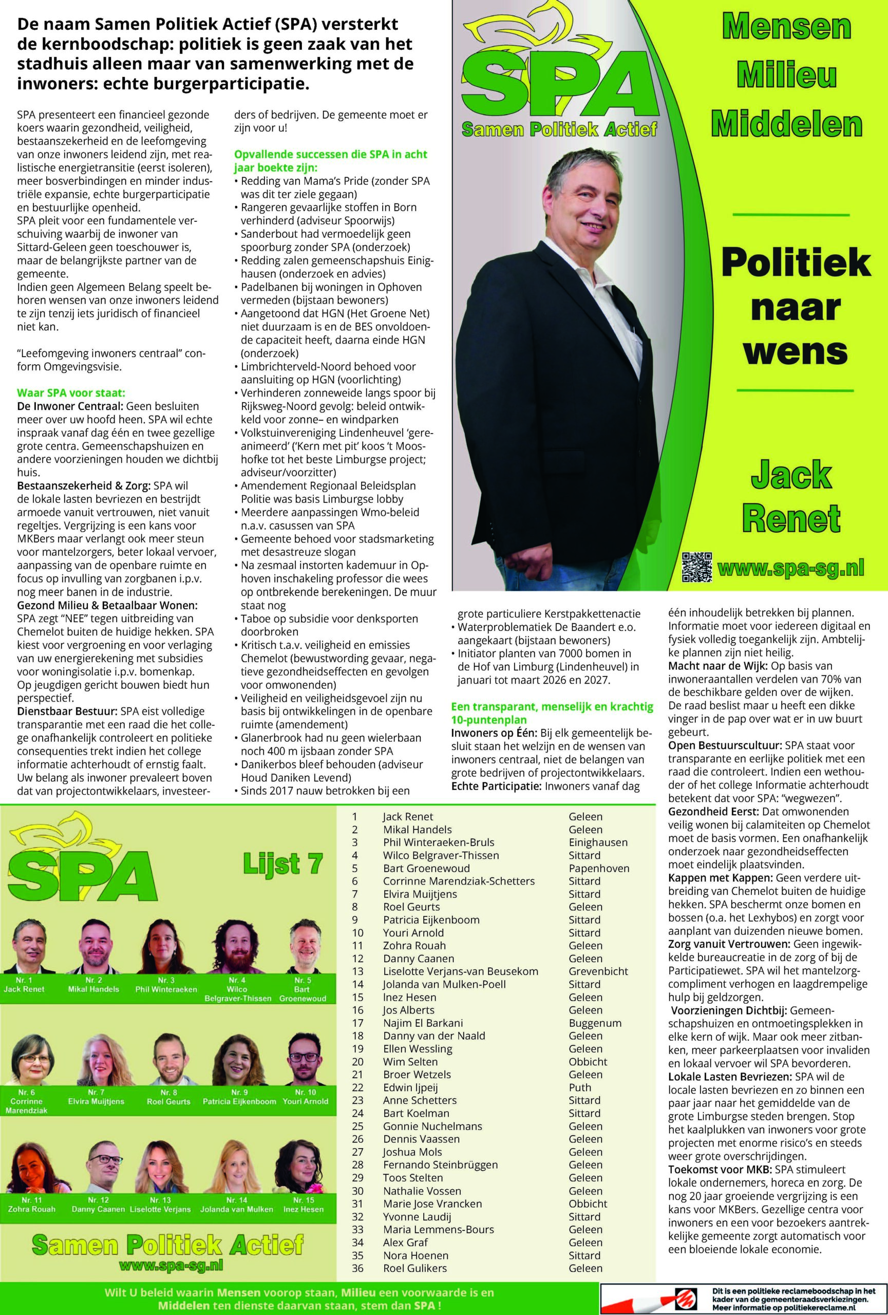 Ongeveer 30% van de Nederlandse bevolking heeft een beperking waarvan 6% ernstig. Van de mensen met een beperking heeft ongeveer 15-20% dat vanaf de geboorte. Ongelukken en ziekte veroorzaken 30-40% en ouderdom veroorzaakt 40-50% van het aantal mensen met beperkingen. Als een ding duidelijk is dan is het wel dat inclusie van deze grote groep mensen, meer dan 5 miljoen, nodig is. Sittard-Geleen heeft relatief veel ouderen (26% boven 65 jaar, ruim 24000 mensen) waardoor het aantal mensen met een beperking hoger zal zijn dan het landelijke gemiddelde. SPA heeft 6 mensen met een beperking op de lijst staan. De verhalen van deze mensen geven aan dat het iedereen kan overkomen en dat het enorme impact op het leven heeft. Zij zitten niet bij de pakken neer en doen echt mee. Mensen zonder beperking moeten m.i. veel meer rekening houden met mensen met beperkingen dan nu gebeurt en vooral politici. |