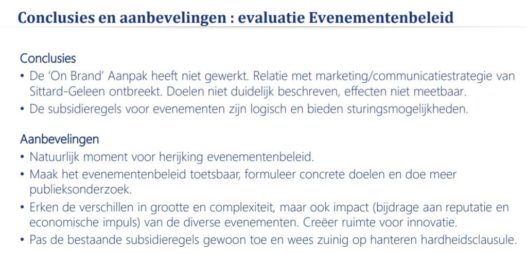 Zitterd Revisited (hoeveel Nederlanders en ook buitenlanders zijn er tweemaal in Sittard geweest??), Sportzones, evenementen, het heeft niet geholpen om zelfs maar bij de top-50 te komen, iets wat als 33e gemeente van Nederland qua inwoners geen heel ambitieus doel is. Dit ondanks dat we in achtereenvolgende coalitieakkoorden, toekomstvisies, omgevingsvisies en centrumplannen lezen dat we ‘met recht trots zijn op onze stad’.