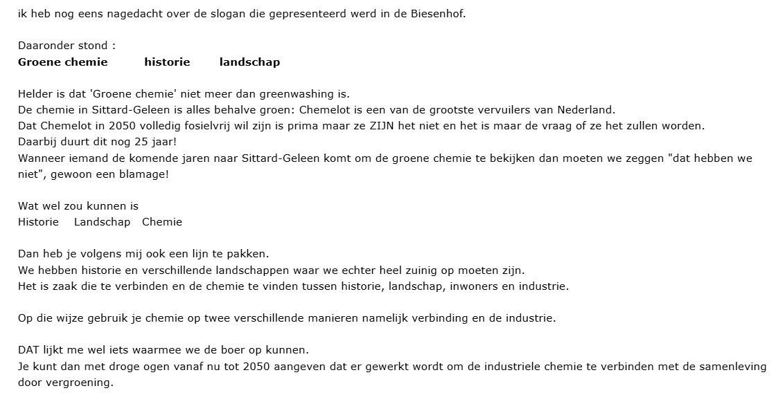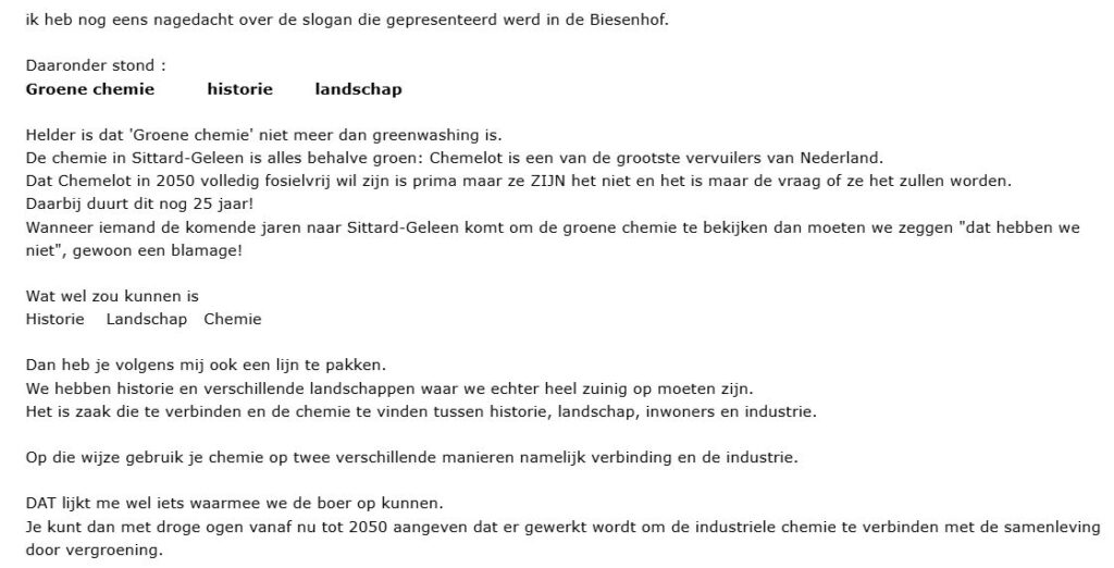 Met haar lucht- en watervervuiling, incidenten die met regelmaat het landelijke nieuws halen, de onveiligheid die uitgaat van grote chemische installaties hebben we toch echt wel iets in huis waardoor Sittard-Geleen (zelfs inter)nationale bekendheid heeft. Niets voor niets staat Chemelot centraal bij de ontwikkeling van Sittard-Geleen en wordt daar keer op keer het welzijn van onze inwoners voor terzijde geschoven.